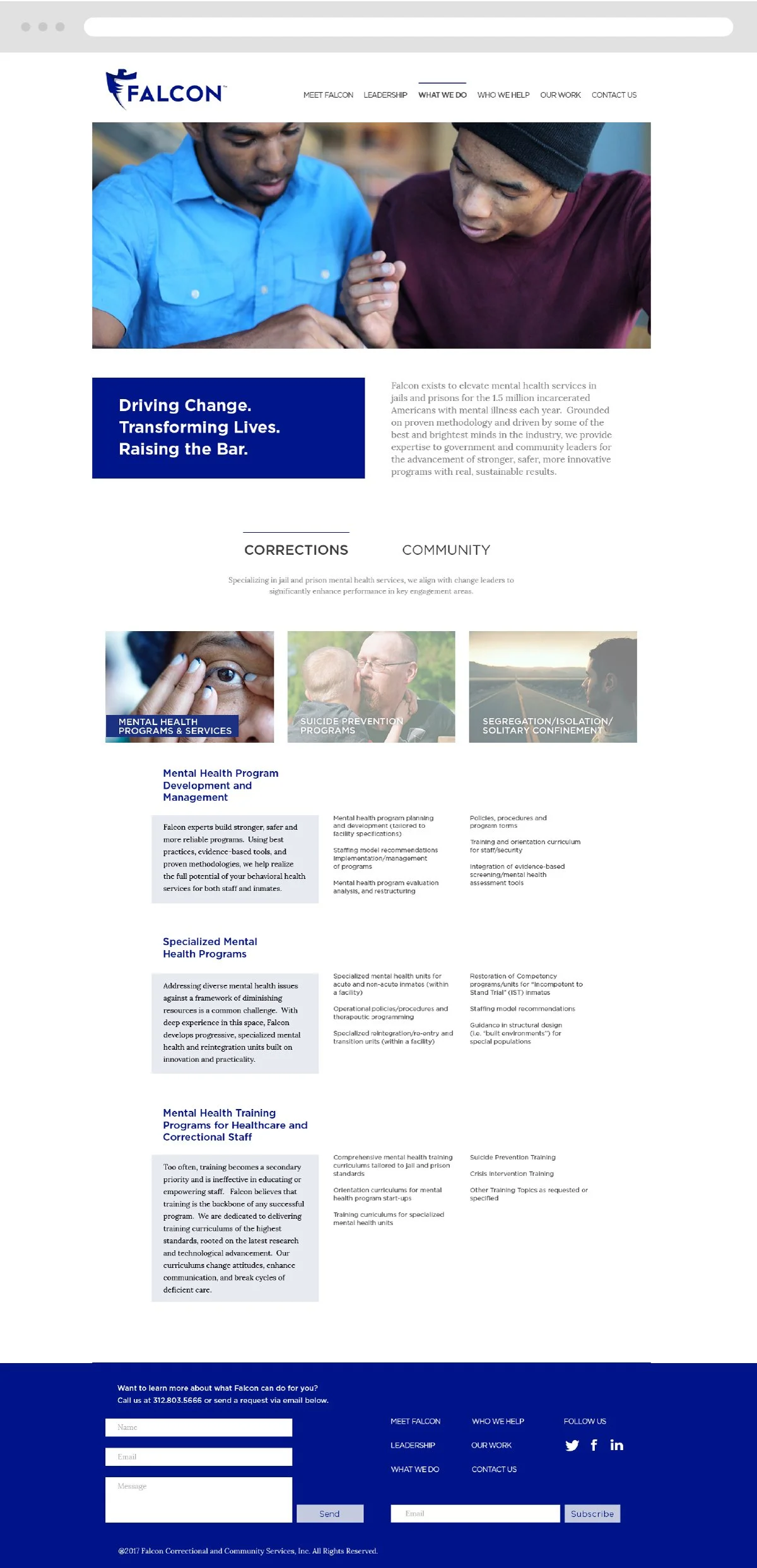 Centered on mental wellness within the prison system, Falcon Inc presented a unique challenge—balancing authority with compassion through thoughtful, impactful design. Beginning with a logo design this project quickly expanded into a full brand rollout, including the website, videos, marketing materials, and trade show booths. The result was a cohesive brand that communicated both structure and empathy across all materials.
